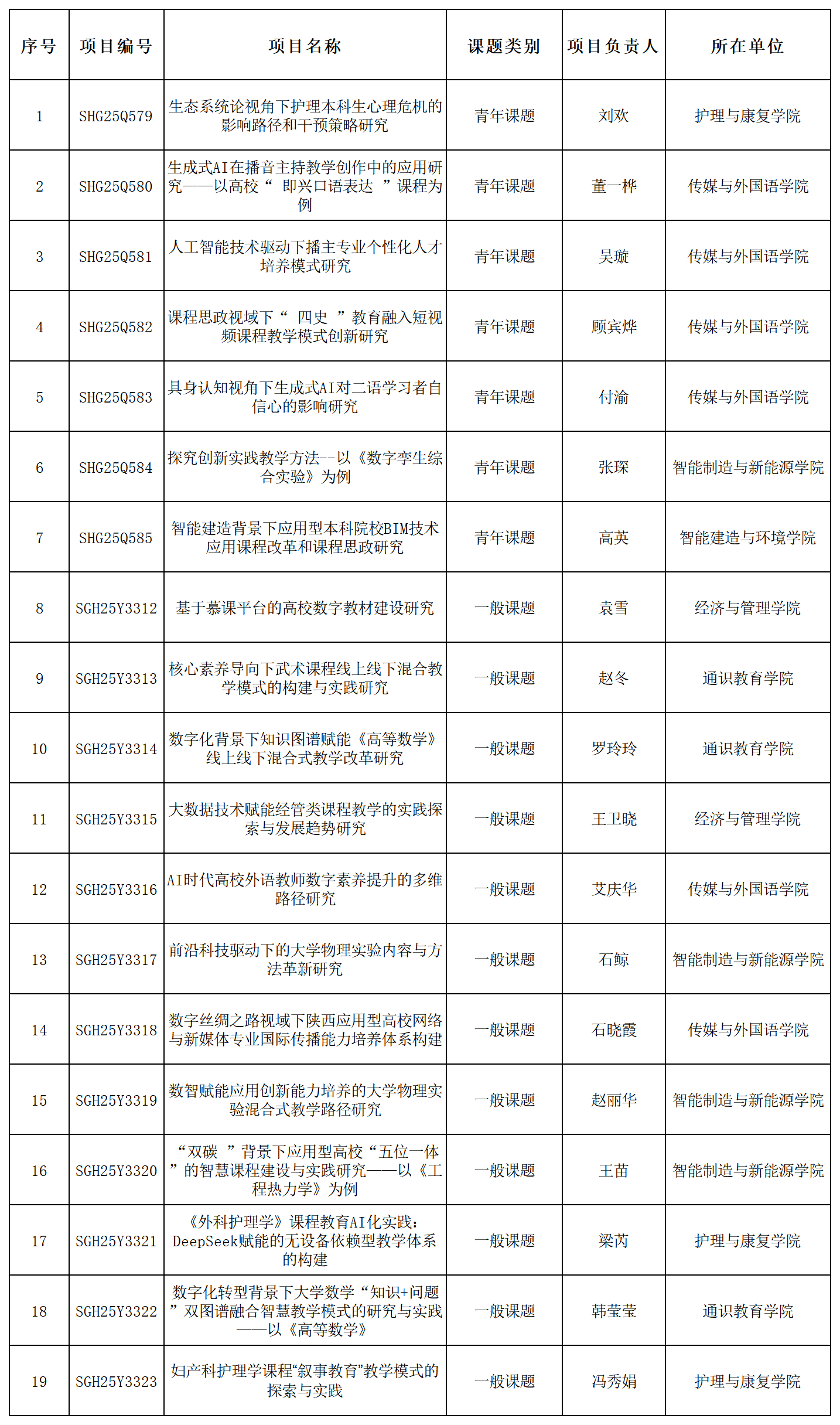 陕西省教育科学“十四五”规划2025年度课题,经资格审核、专家评审、立项公示、省规划办最终审定等程序,我校共19项课题获得立项,其中青年课题7项,一般课题12项,具体立项结果如下: