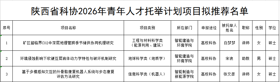 根据《关于开展2026年陕西省科学技术协会青年人才托举计划项目申报工作的通知》要求及《陕西省科学技术协会青年人才托举计划项目管理办法》相关规定,学校积极组织申报工作,并严格按照评审程序,联络校内专家组成评审组,采用了匿名通讯评审的方式对申报项目进行综合审查。经专家评议,现将拟推荐上报的项目名单公示如下(排名不分先后):